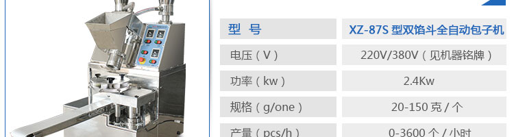 XZ-87S型雙餡斗全自動包子機(jī),可生產(chǎn)各種肉包、肉菜包、菜包、小籠包、湯包、水晶包、圓饅頭、奶黃包、豆沙包、叉燒包、南瓜餅等幾十種包餡制品。適用于賓館、飯店、學(xué)校、機(jī)關(guān)企業(yè)食堂、饅頭或包子加工廠、早餐工程店及速凍食品廠等單位??蓾M足不同客戶群體。免費(fèi)提供工藝技術(shù)。免費(fèi)上門培訓(xùn)指導(dǎo)安裝。