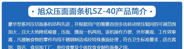 名稱SZ40、SZ60壓面面條機系列 電源220/380V 220/380V 功率1.1KW 1.5KW 產量 尺寸外形尺寸580*370*1000mm 450*400*860mm 重量75kg 85kg 規格 其他